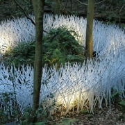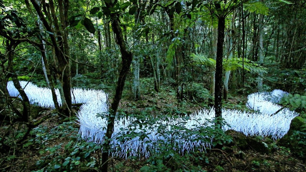25,000 fluorescent light globes as reimagined discarded working waste in rainforest,