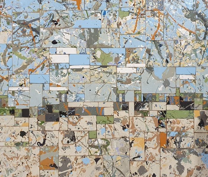 Recycled synthetic polymer paint on wood panel, performance painting assemblage.